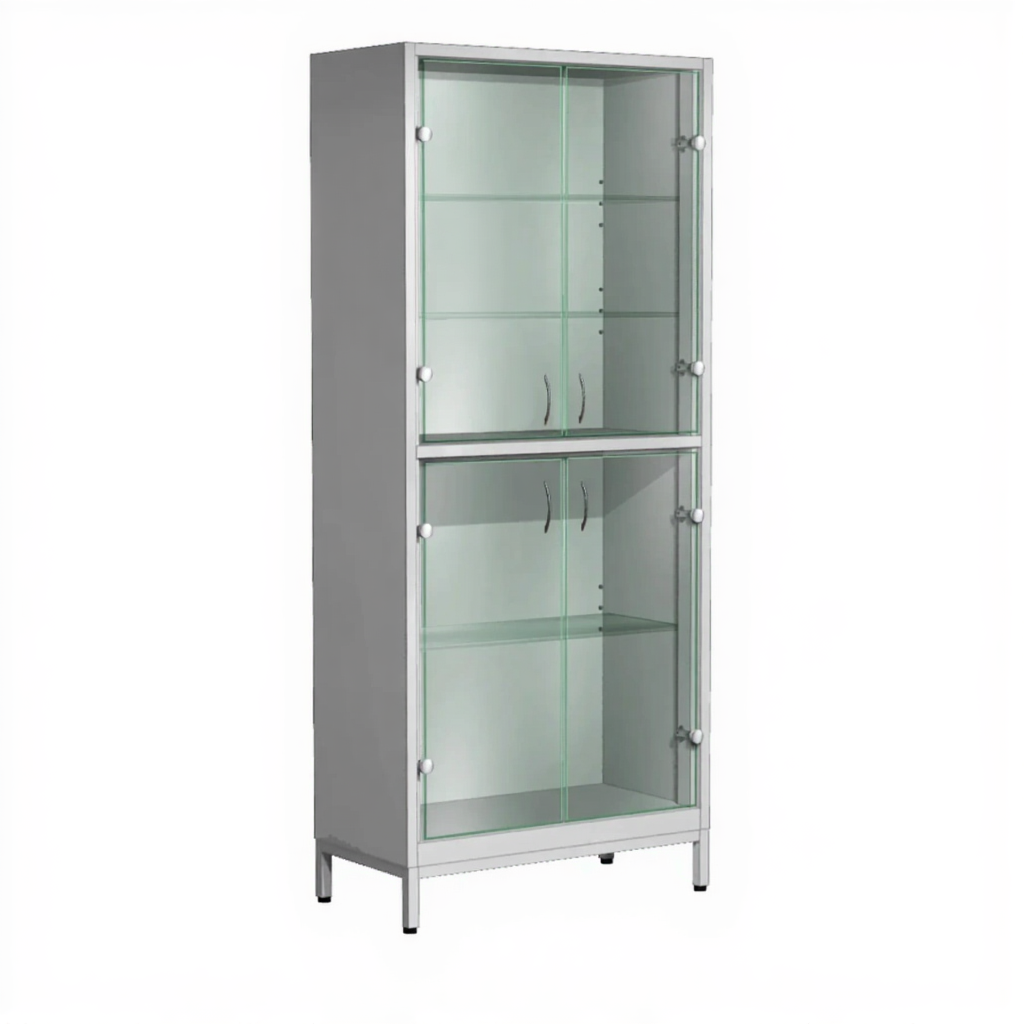 Шкаф для лабораторной посуды ШМЛП-2 (корпус металл серый) предназначен для размещения лабораторной посуды, документов, материалов, инструментов и приборов, а также спецодежды для персонала. Модель имеет двухсекционную двухстворчатую конструкцию с полным остеклением: верхняя секция с двумя стеклянными дверками и двумя стеклянными полками, нижняя секция с двумя стеклянными дверками и одной стеклянной полкой. Корпус выполнен из стального листа с полимерно-порошковым покрытием, каркас из стального профиля.