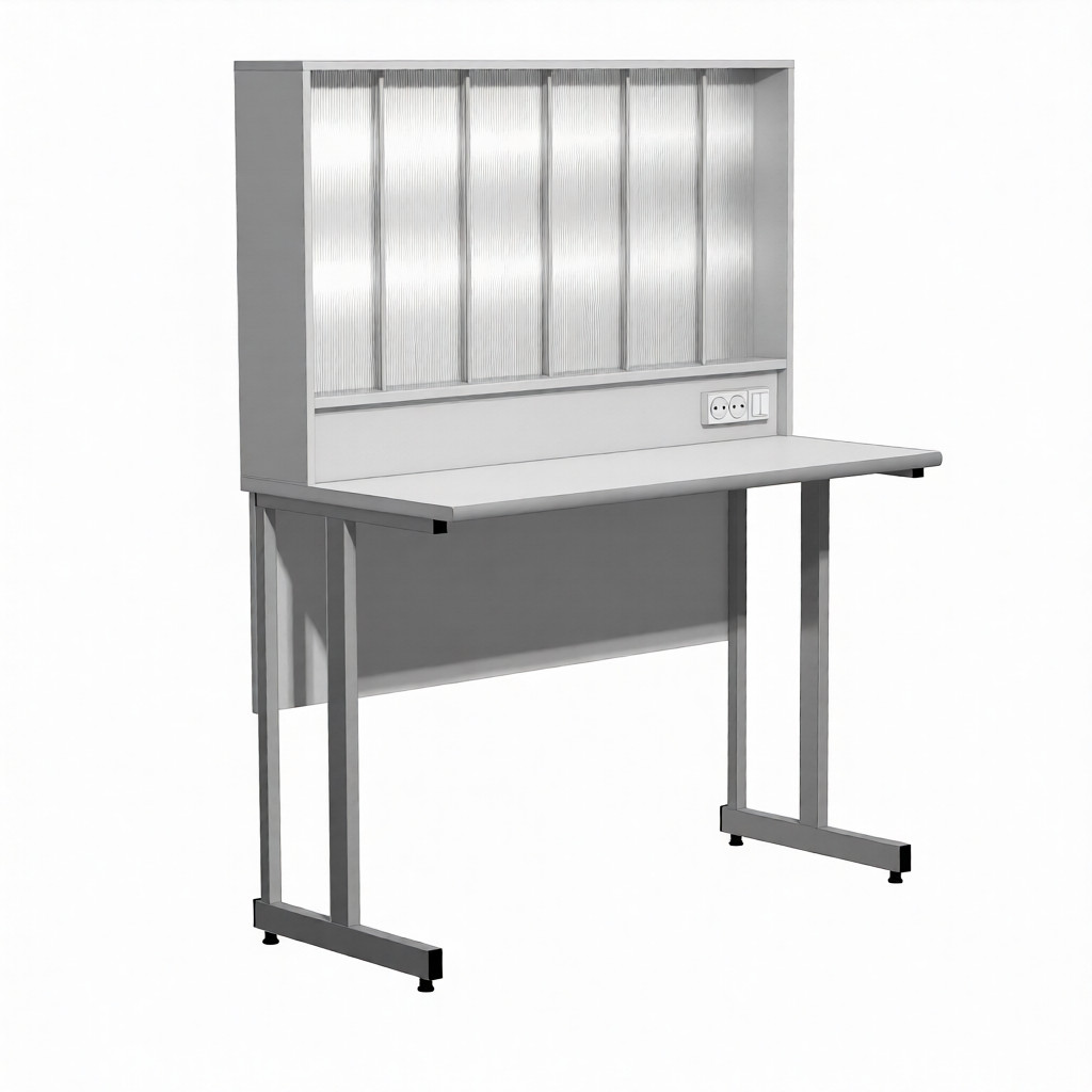 - Специализированная надстройка — зона для титрования со стойками для бюреток 5 шт. (пруток 10 мм), стеклянный экран, подсветка, 2 розетки, двойной выключатель.