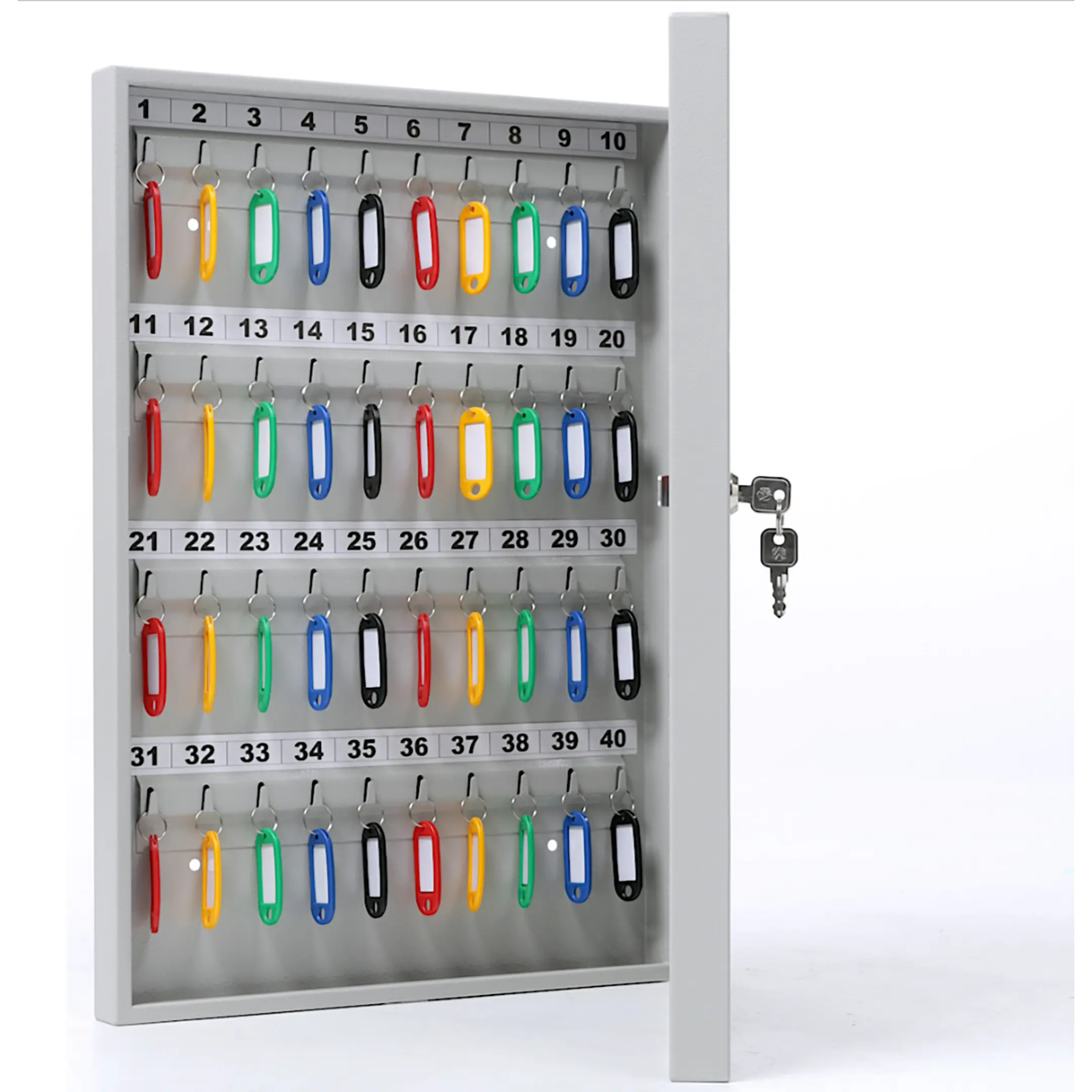 - Эффективная организация и быстрый поиск — восемьдесят пронумерованных ячеек и комплект брелков создают четкую и прозрачную систему. Это позволяет мгновенно находить нужный ключ, вести точный журнал учета и легко контролировать их выдачу и возврат ответственными лицами, повышая операционную эффективность.