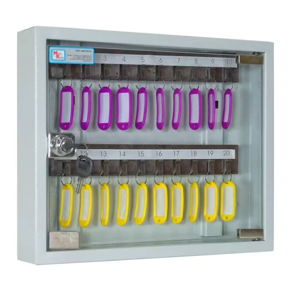 - Идеальная вместимость для рабочих мест и кабинетов — система рассчитана на 20 ключей, что оптимально для организации хранения в кабинете руководителя, на стойке администратора, в диспетчерской или небольшом отделе, где требуется поддерживать порядок для ответственного, но не избыточного количества ключей.