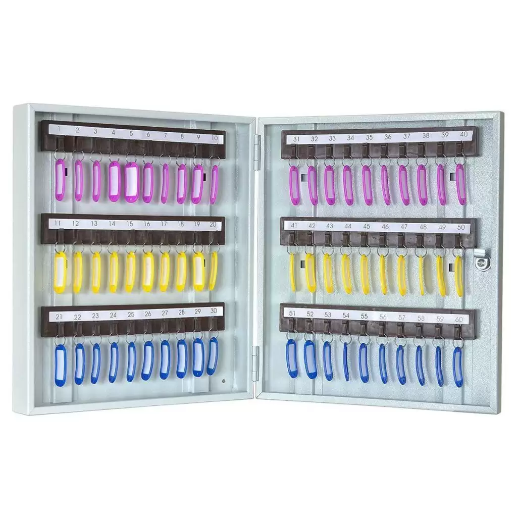 - Готовая система для быстрого внедрения учета — шестьдесят пронумерованных ячеек и комплект соответствующих брелков создают четкую и прозрачную систему. Это позволяет сразу начать ведение журнала учета, мгновенно находить нужный ключ и контролировать их движение между сотрудниками, минимизируя ошибки и потери времени.