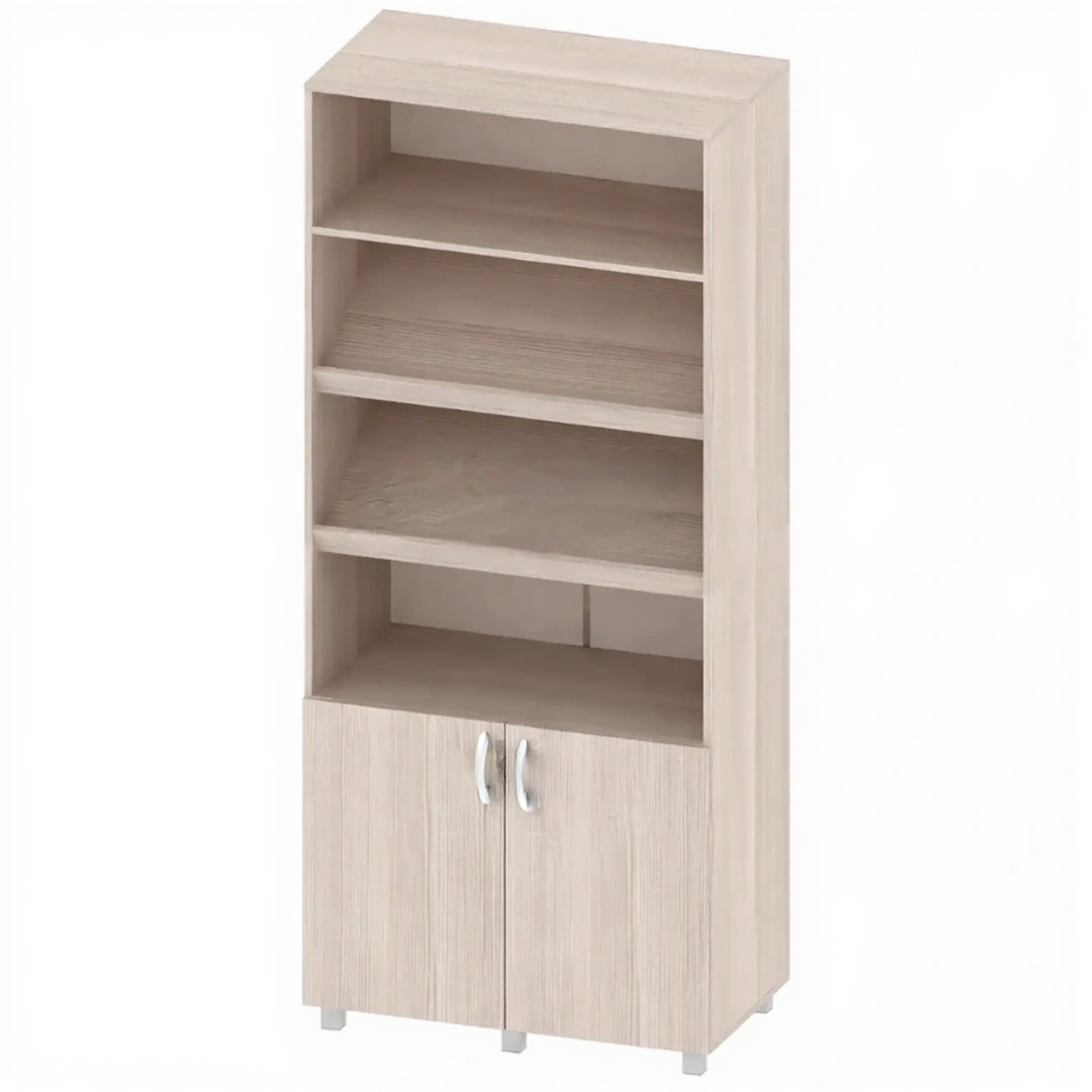 - Комбинированная конструкция — нижние закрытые шкафчики для хранения материалов, требующих защиты, и верхняя открытая ниша для демонстрации и быстрого доступа.
