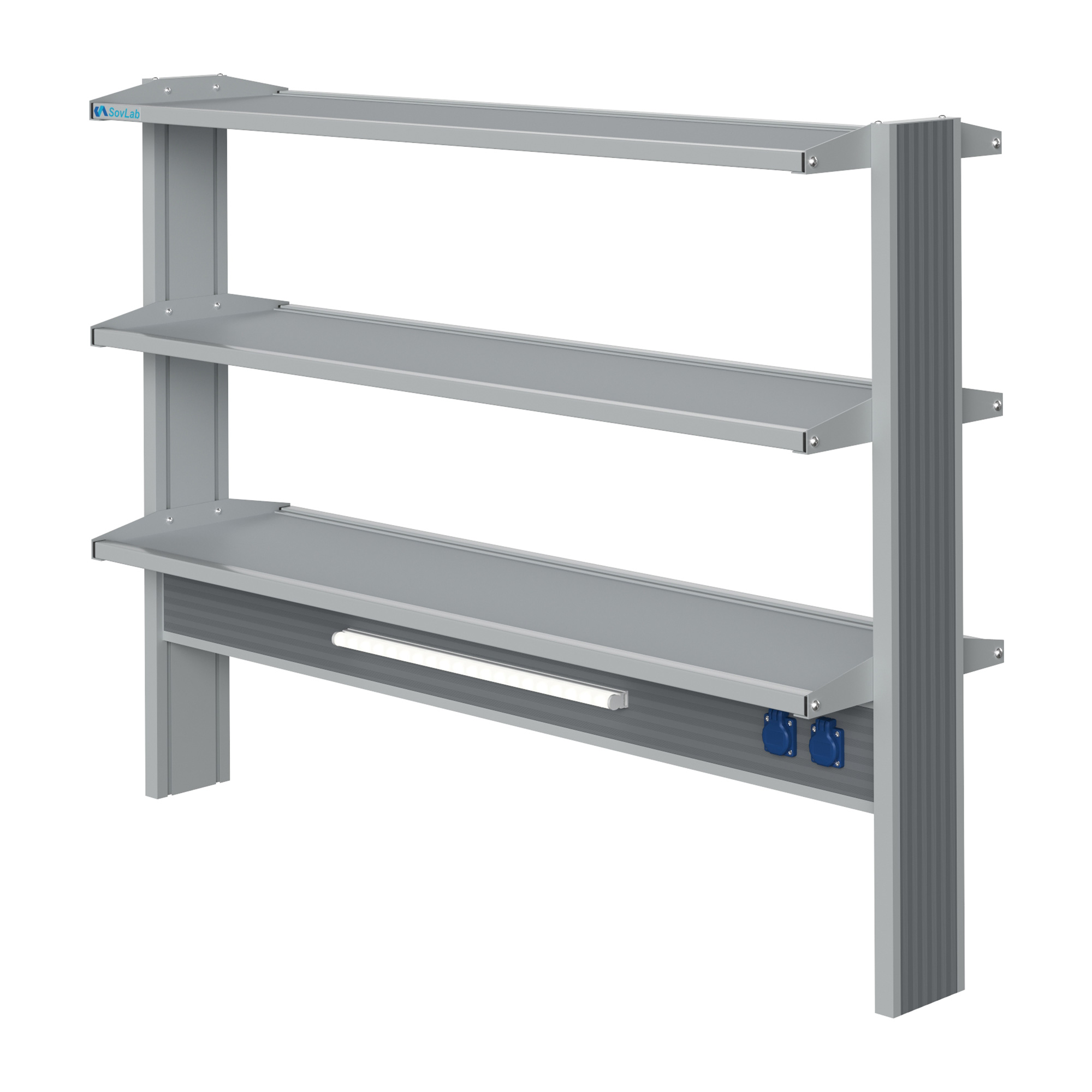 Технологический высокий островной стеллаж Mod. 1500 ТСОв — это специализированное лабораторное оборудование, устанавливаемое на рабочую поверхность островных столов и предназначенное для размещения лабораторной посуды, расходных материалов, инструментов, приборов и другого лабораторного оборудования. Модель оснащена тремя полками, блоком электророзеток и светодиодными светильниками для местного освещения.