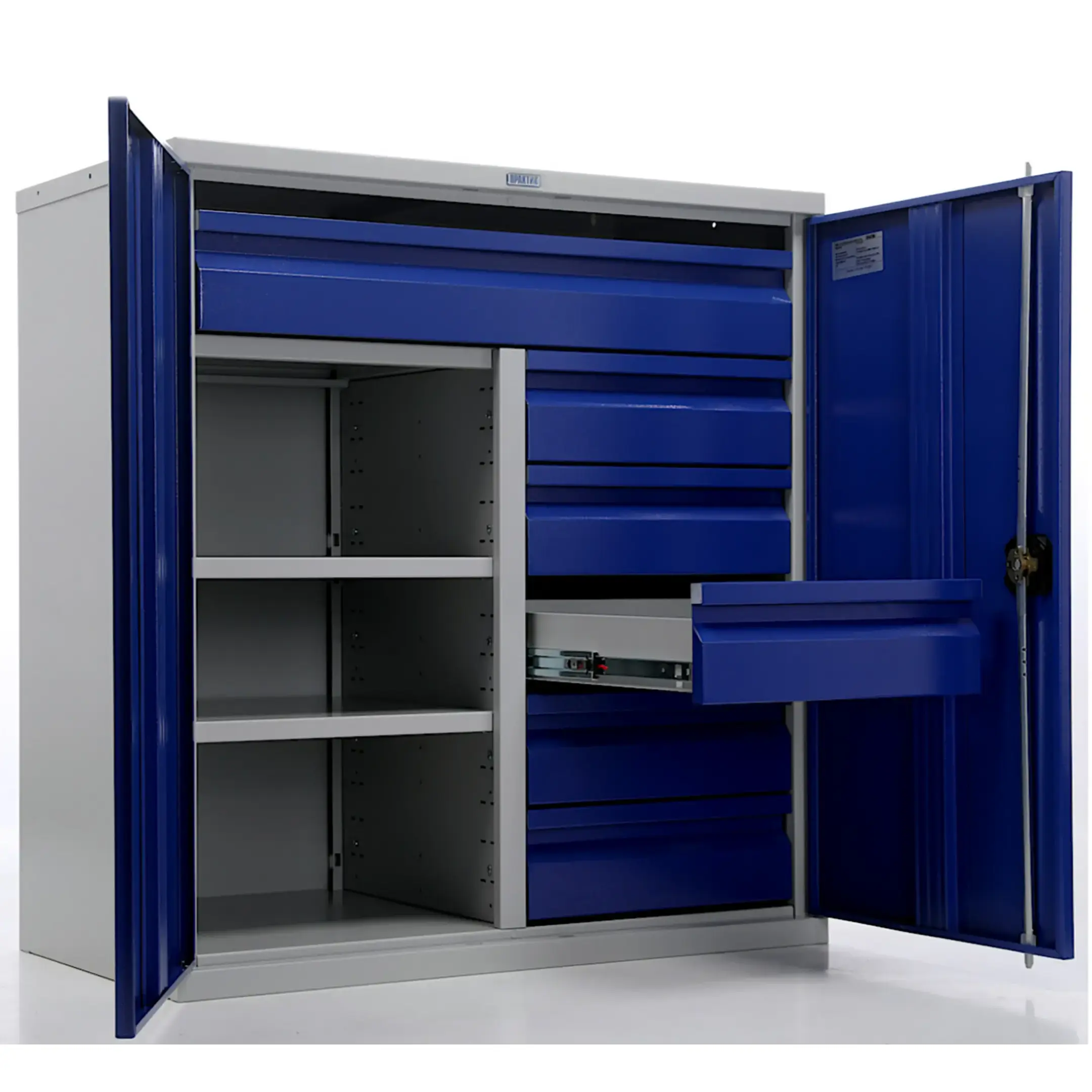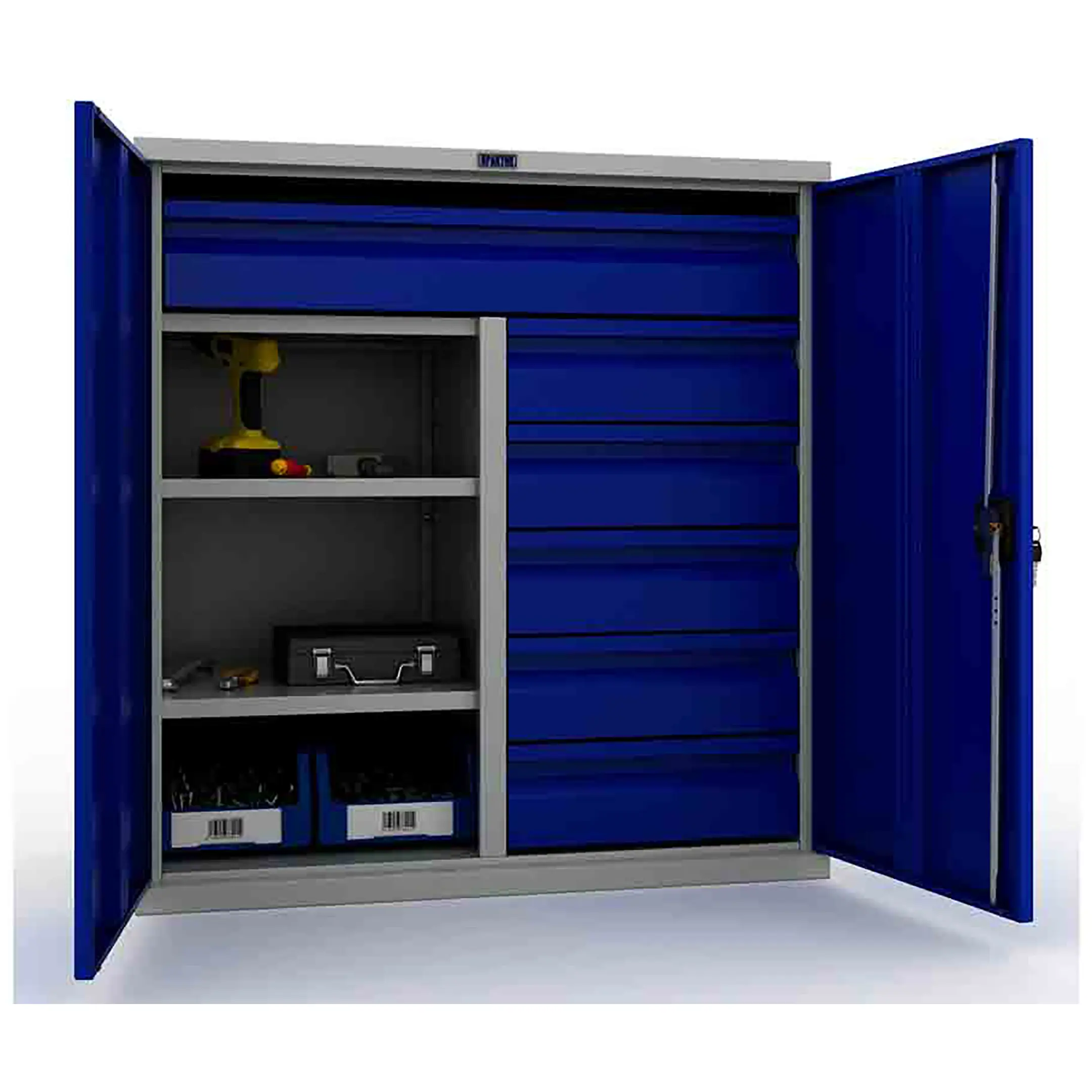 - Надежная защита инструментального парка — цельнометаллический корпус с запирающимися на общий замок дверями обеспечивает высокий уровень безопасности. Это защищает содержимое от краж, несанкционированного доступа, а также от пыли, грязи, стружки и влаги, характерных для производственной среды.