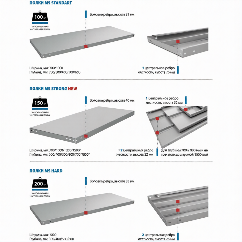 • каждая полка усиливается 1 центральным ребром жёсткости высотой 26 мм;