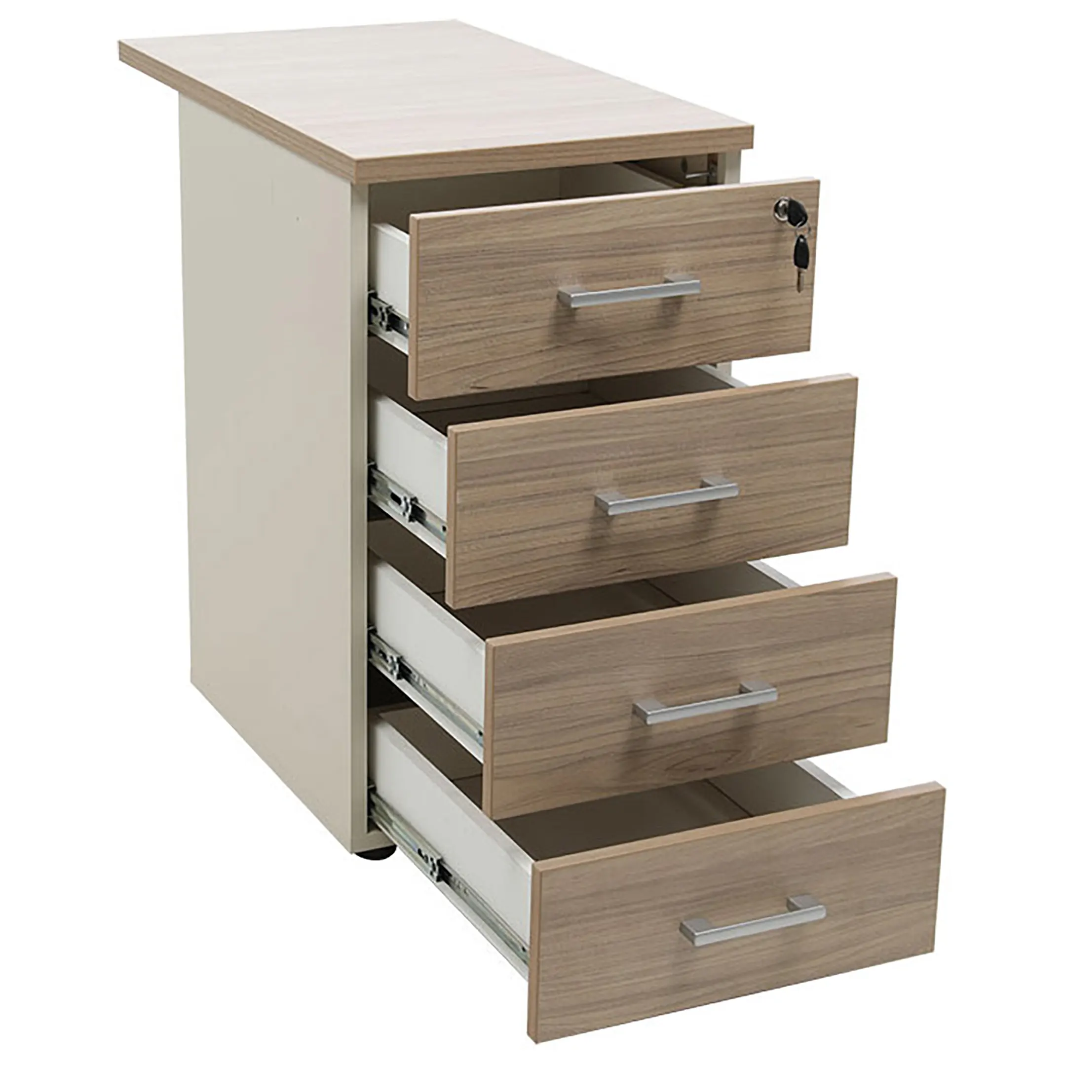 • Тумба снабжена центральным замком и оснащена пластмассовым лотком для канцелярских принадлежностей в верхнем ящике.