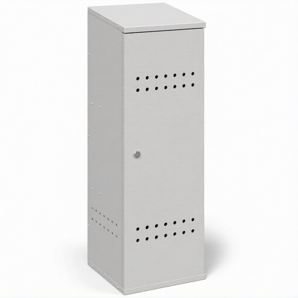 - Соблюдение базовых требований пожарной безопасности — шкаф оснащен всеми необходимыми элементами для безопасного хранения: запирающейся дверцей с замком и вентиляционными отверстиями (перфорацией) в нижней и верхней части корпуса. Это обеспечивает отвод газа в случае утечки и предотвращает образование взрывоопасной концентрации внутри шкафа.