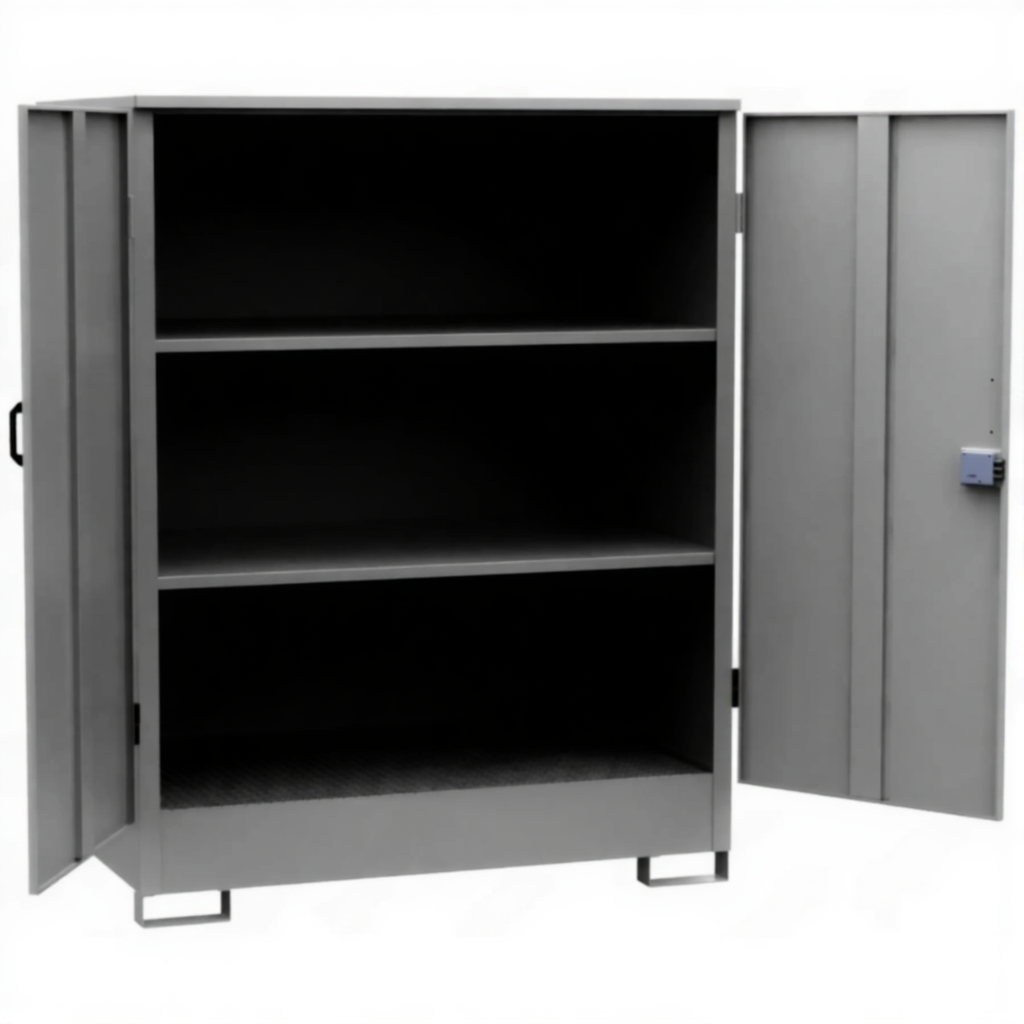 - Повышенная безопасность и соответствие нормам — изготовлен из химически стойких материалов, часто оснащен системой вентиляции, поддоном для сбора проливов и самозакрывающимися дверцами с замком, что соответствует требованиям правил хранения опасных веществ (ПБ, ГОСТ).