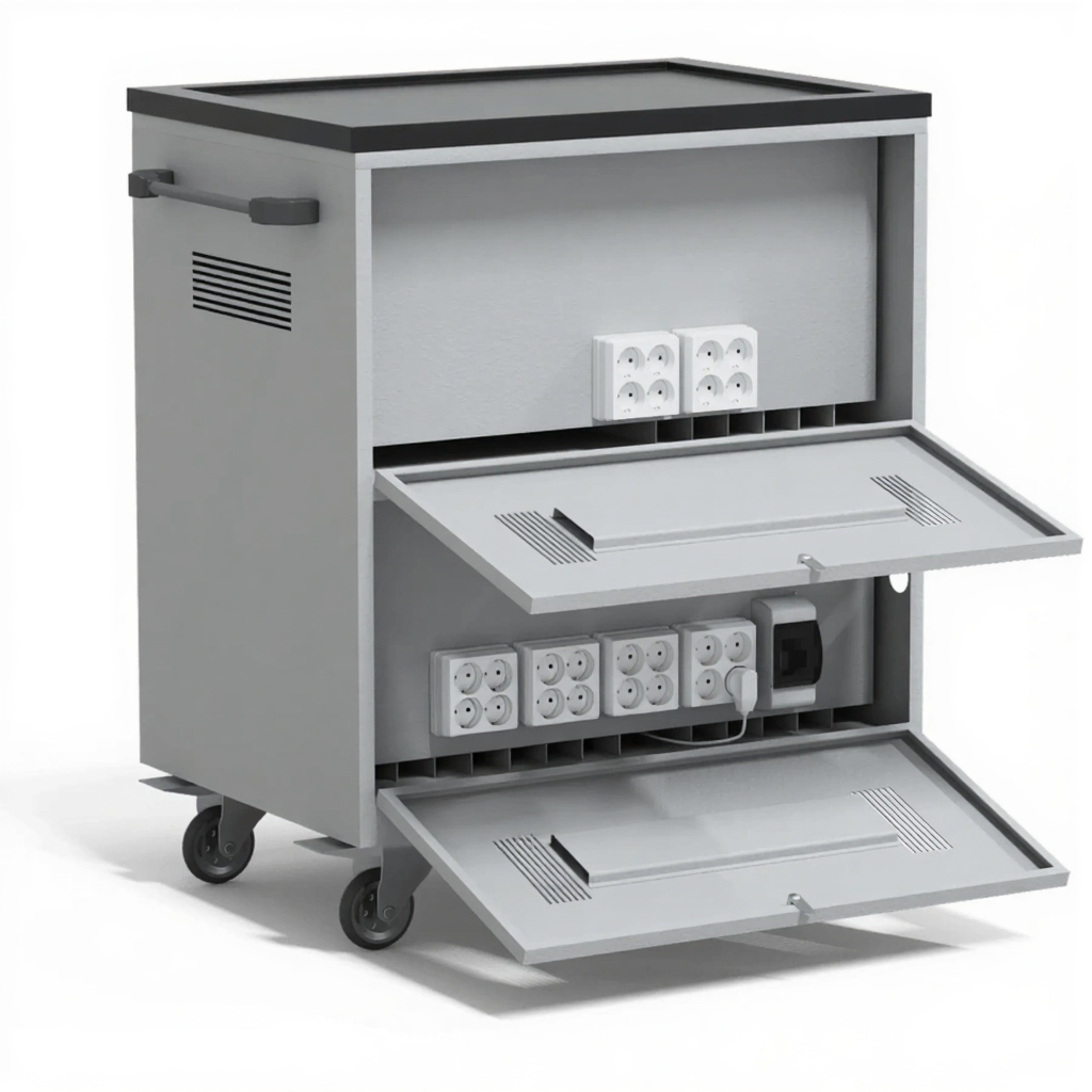 - Надежная защита и организация — прочный корпус с запирающимися дверцами защищает технику от кражи и повреждений. Каждый ноутбук имеет свое закрепленное место, что предотвращает хаос и ускоряет процесс раздачи и сбора.